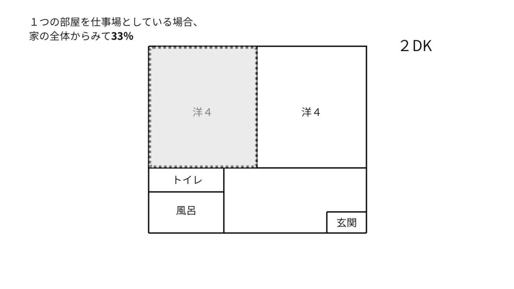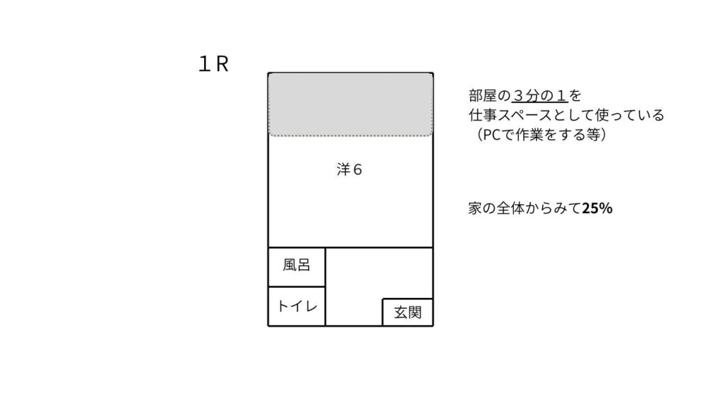 これは人によって割合が変わってきやすい(2つ部屋があって1つ仕事部屋にしているパターンと、ワンルームマンションで1部屋を仕事場とプライベートにしている場合は、割合が変わってくる)です。